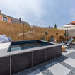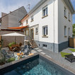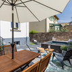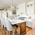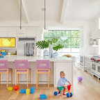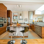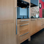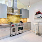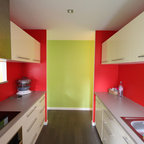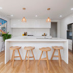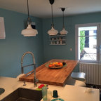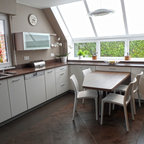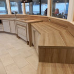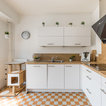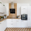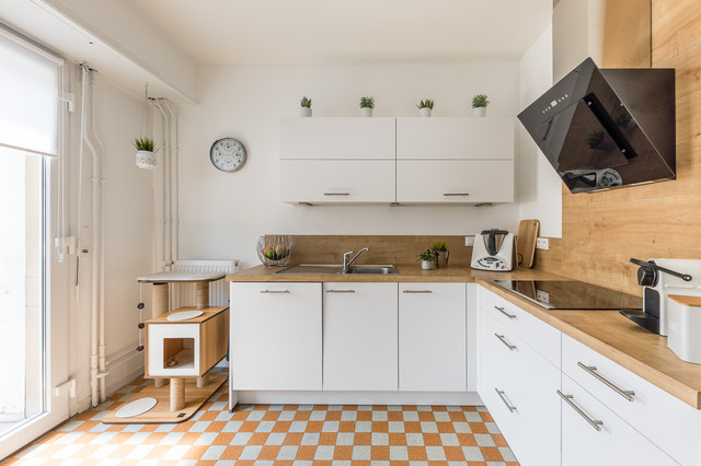 Esempio di una cucina a L minimal con lavello da incasso, ante lisce, ante bianche, top in legno, paraspruzzi in legno, elettrodomestici neri, nessuna isola e pavimento arancione — Houzz