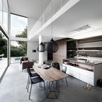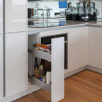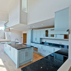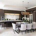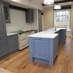 Esempio di una cucina a L design di medie dimensioni con lavello sottopiano, ante grigie, paraspruzzi bianco, paraspruzzi in marmo, elettrodomestici in acciaio inossidabile, parquet scuro, isola, pavimento marrone e top bianco — Houzz