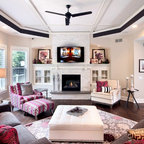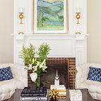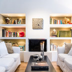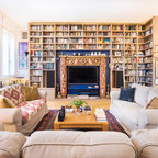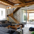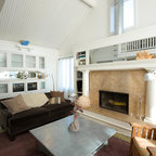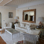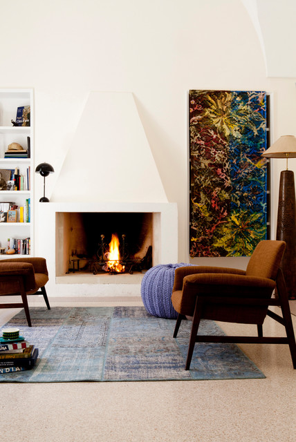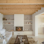 Foto di un soggiorno mediterraneo aperto con pareti beige, camino classico, cornice del camino in intonaco e nessuna TV — Houzz