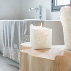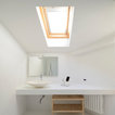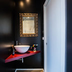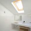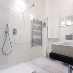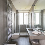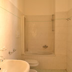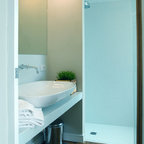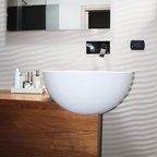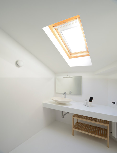 Esempio di una stanza da bagno moderna con pareti bianche, lavabo a bacinella, pavimento bianco e top bianco — Houzz