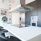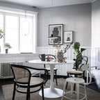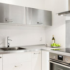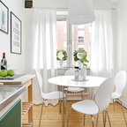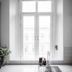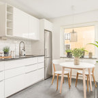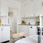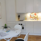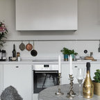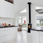 Ispirazione per una cucina nordica di medie dimensioni con ante lisce, ante in legno chiaro, nessuna isola, top nero, lavello sottopiano, paraspruzzi bianco, elettrodomestici neri e pavimento nero — Houzz