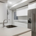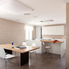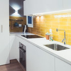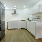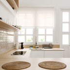 Esempio di una cucina scandinava di medie dimensioni con ante lisce, ante bianche, paraspruzzi bianco, paraspruzzi con piastrelle diamantate e elettrodomestici bianchi — Houzz