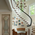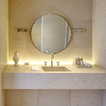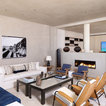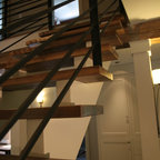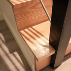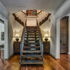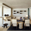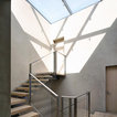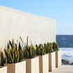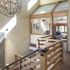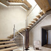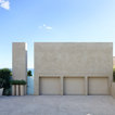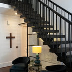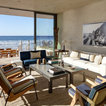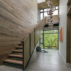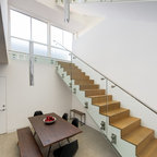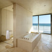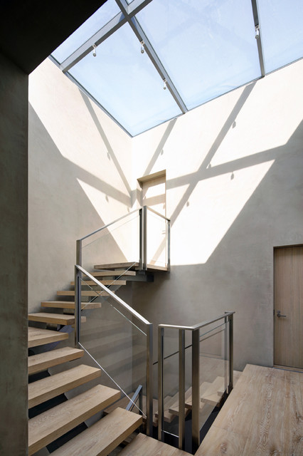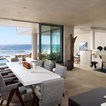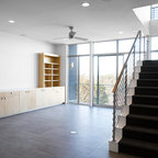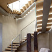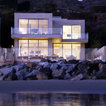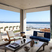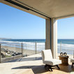 This leads down to the entry courtyard space, defined by the bold architecture on three sides, dense landscape on the other side and a reflecting pool to contrast the manmade with the natural. The solid entry facade, creating intrigue and providing privacy, contrasts with the glass oceanside facades, providing view and transparency. The house is organized around a dramatic skylit central hall with a monumental stair made of wood treads that seem to float on brushed stainless steel supports—the stair is both art/sculpture and architecture. Materials in muted and warm colors—beige plaster walls, floors in random ashlar limestone at the lower seaside level, wire-brushed oak floors at the second floor and stair, and travertine baths—maintain a united color scheme that is punctuated by colorful fabrics and the owner’s collection of tribal art and modern furnishings.