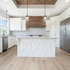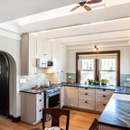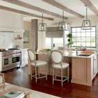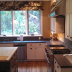 Ispirazione per una grande cucina lineare country chiusa con lavello stile country, ante con bugna sagomata, ante grigie, top in marmo, paraspruzzi beige, paraspruzzi con piastrelle in pietra, elettrodomestici in acciaio inossidabile, pavimento in gres porcellanato e pavimento grigio — Houzz
