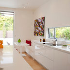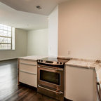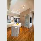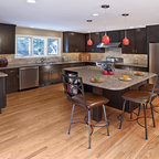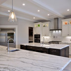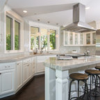 Esempio di una cucina design di medie dimensioni con lavello sottopiano, ante lisce, ante marroni, top in marmo, paraspruzzi bianco, paraspruzzi in marmo, elettrodomestici in acciaio inossidabile, isola, pavimento marrone e pavimento in legno massello medio — Houzz