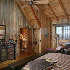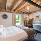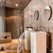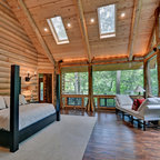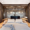 Vista della camera da letto principale dall'ingresso della camera. La vetrata alle spalle del letto delimita l'area dedicata al benessere