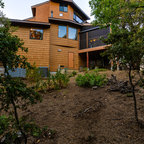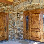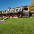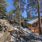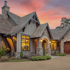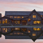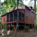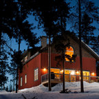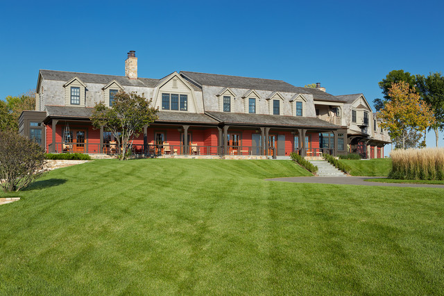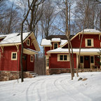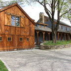 Idee per la facciata di una casa ampia rossa rustica a due piani con rivestimento in legno — Houzz