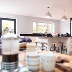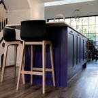 Two different colour cabinets love stools like the idea of breakfast bar and being able to watch the cooking happening