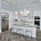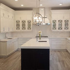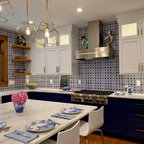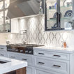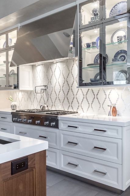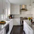 Foto di una cucina tradizionale di medie dimensioni con lavello sottopiano, ante con riquadro incassato, ante bianche, top in superficie solida, paraspruzzi bianco, elettrodomestici in acciaio inossidabile, pavimento in gres porcellanato e paraspruzzi con piastrelle a mosaico — Houzz