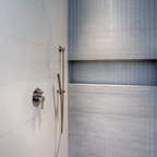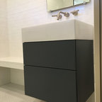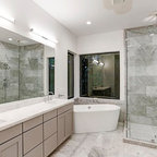 Esempio di una grande stanza da bagno padronale contemporanea con lavabo da incasso, ante lisce, ante in legno scuro, vasca da incasso, piastrelle bianche, pareti grigie, piastrelle in gres porcellanato, pavimento in gres porcellanato, top in quarzo composito e pavimento beige — Houzz