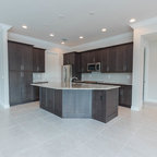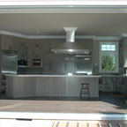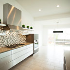 Idee per una cucina a L design con lavello sottopiano, nessun'anta, ante in legno bruno, paraspruzzi a effetto metallico, elettrodomestici in acciaio inossidabile e pavimento in legno massello medio — Houzz