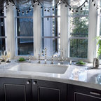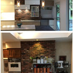 Marble plus brick. Glass pendants don’t overwhelm space or feel heavy