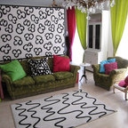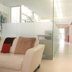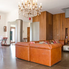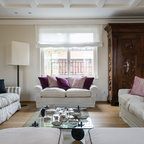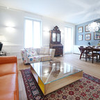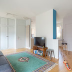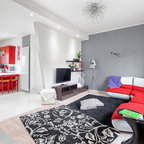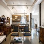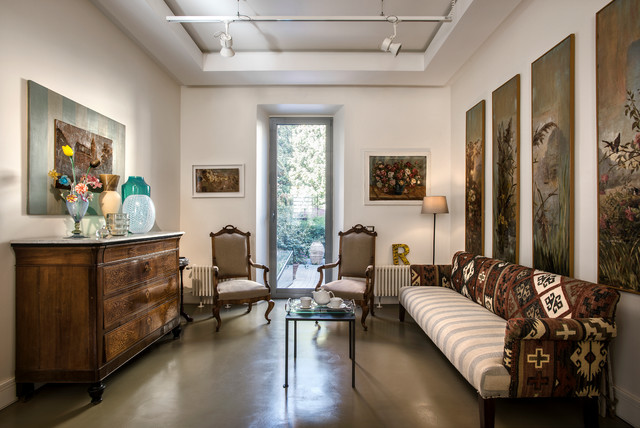 Ispirazione per un piccolo soggiorno eclettico chiuso con sala formale, pareti bianche, pavimento in cemento e pavimento grigio — Houzz