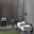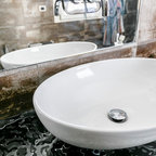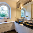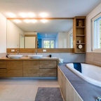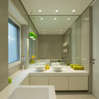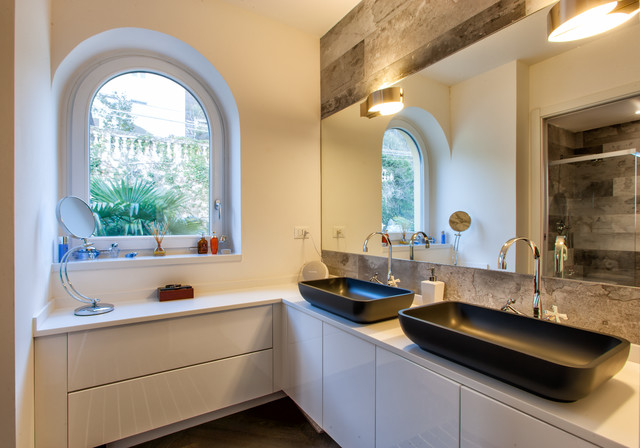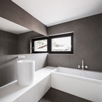 Foto di una stanza da bagno padronale minimalista di medie dimensioni con ante lisce, ante bianche, pareti bianche e lavabo a bacinella — Houzz