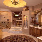Freestanding tub with chandelier above, traditional style tub filler