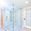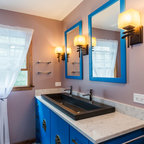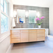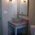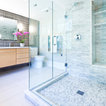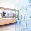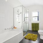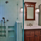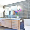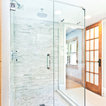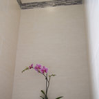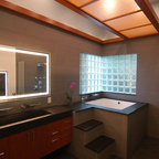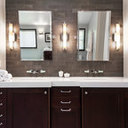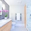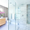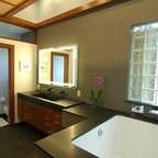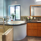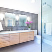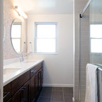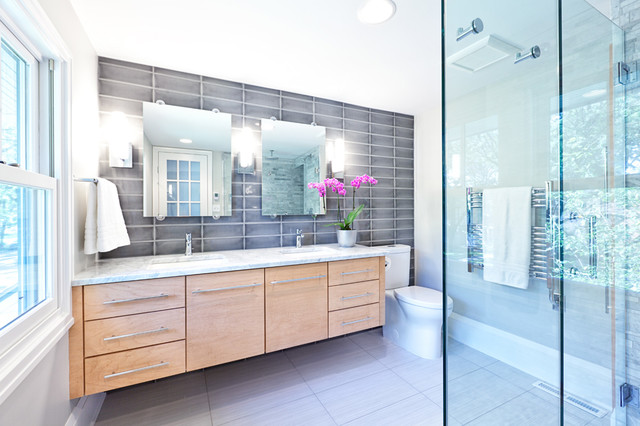 Esempio di una stanza da bagno padronale design di medie dimensioni con ante lisce, ante in legno chiaro, doccia alcova, WC monopezzo, piastrelle grigie, piastrelle in ceramica, pareti grigie, pavimento in gres porcellanato, lavabo sottopiano, top in marmo, pavimento grigio e porta doccia a battente — Houzz