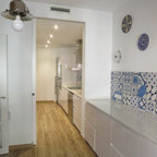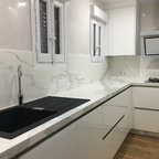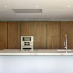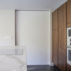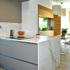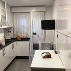 Foto di una cucina minimalista di medie dimensioni con lavello sottopiano, ante lisce, ante bianche, paraspruzzi bianco, elettrodomestici in acciaio inossidabile e isola — Houzz