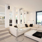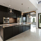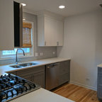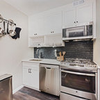 Ispirazione per una cucina parallela minimal con lavello sottopiano, ante lisce, ante bianche, parquet scuro e isola — Houzz