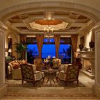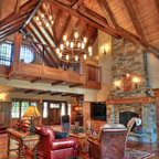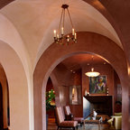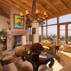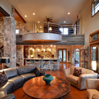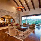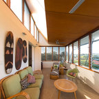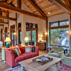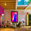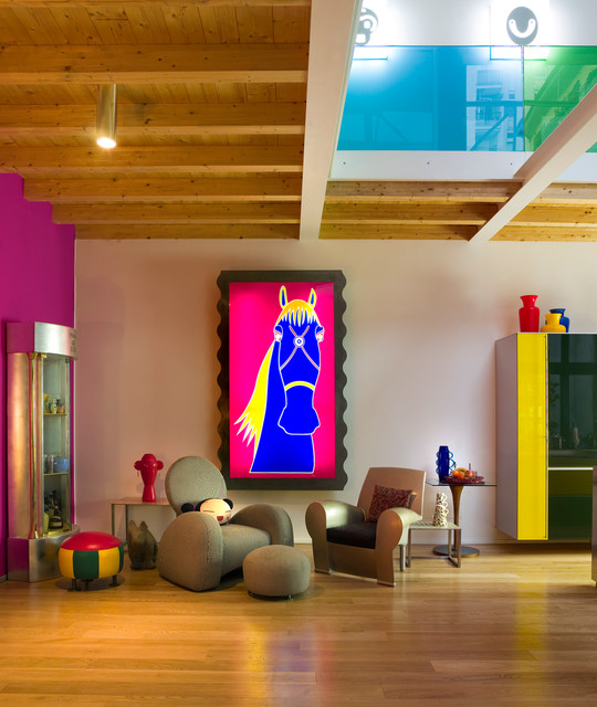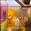 Exposed wood beams in ceiling. Color largely contributed by a pink wall, complemented by introduction of bright furniture as well as blue and green glass railing panels. Neither minimalist nor maximalist!