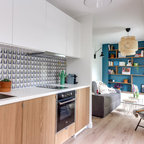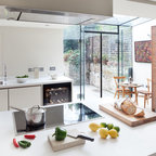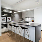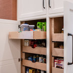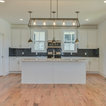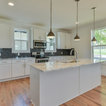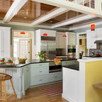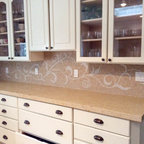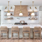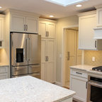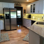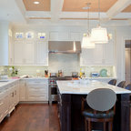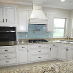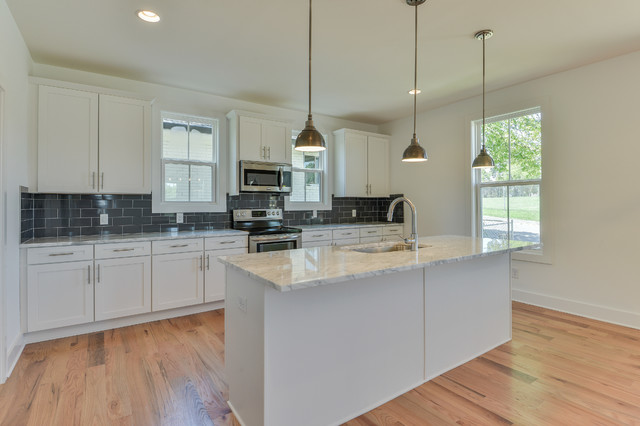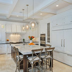 Immagine di una grande cucina classica con lavello a vasca singola, ante bianche, top in marmo, paraspruzzi grigio, paraspruzzi con piastrelle diamantate, elettrodomestici in acciaio inossidabile, parquet chiaro, isola e pavimento marrone — Houzz