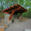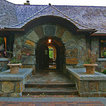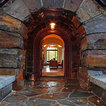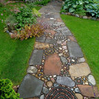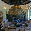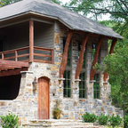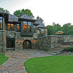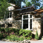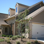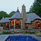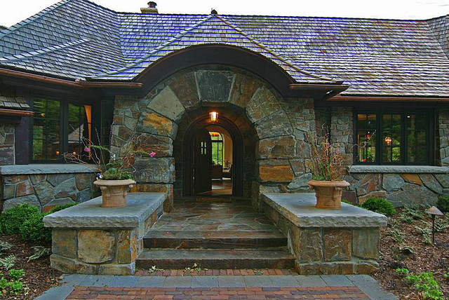 Idee per la facciata di una casa unifamiliare grande beige eclettica a due piani con rivestimento in pietra, tetto a padiglione e copertura a scandole — Houzz