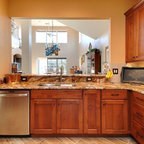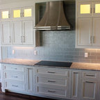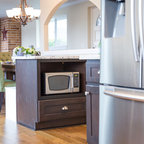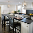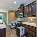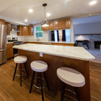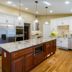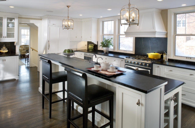 Esempio di una grande cucina ad U chic con ante con riquadro incassato, ante bianche, top in quarzo composito, paraspruzzi nero, paraspruzzi in lastra di pietra, elettrodomestici in acciaio inossidabile, pavimento in legno massello medio, isola e pavimento marrone — Houzz