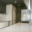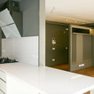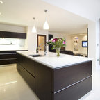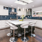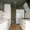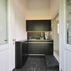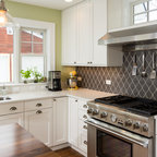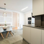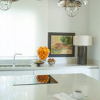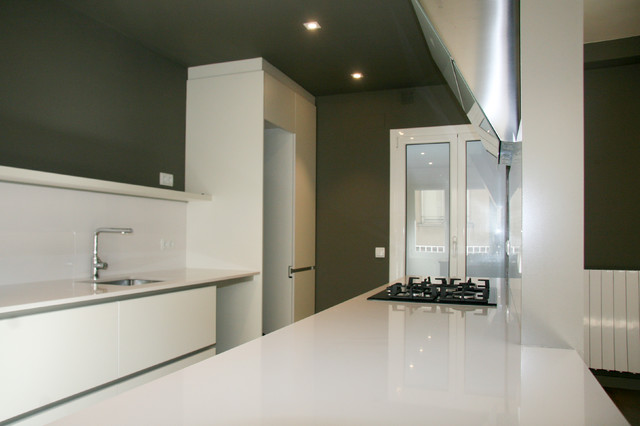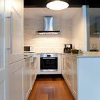 Foto di una cucina design di medie dimensioni con lavello a vasca singola, ante lisce, ante bianche, paraspruzzi bianco, pavimento con piastrelle in ceramica e nessuna isola — Houzz