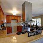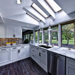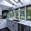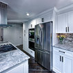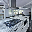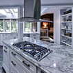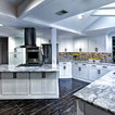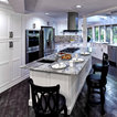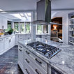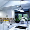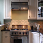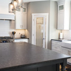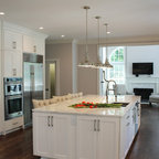 Ispirazione per una grande cucina tradizionale con lavello sottopiano, ante in stile shaker, ante bianche, top in quarzite, paraspruzzi multicolore, paraspruzzi con piastrelle a mosaico, elettrodomestici in acciaio inossidabile, pavimento in gres porcellanato, isola, pavimento grigio e top grigio — Houzz