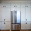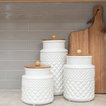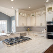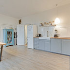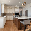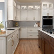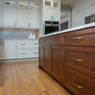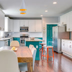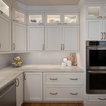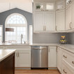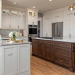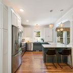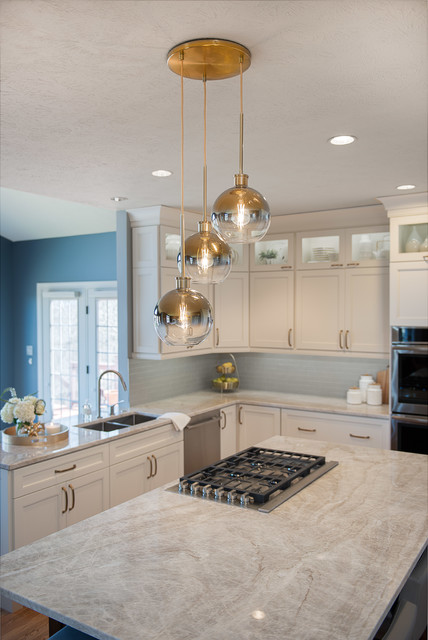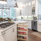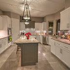 Ispirazione per una cucina tradizionale di medie dimensioni con lavello sottopiano, ante con riquadro incassato, ante bianche, top in granito, paraspruzzi grigio, paraspruzzi con piastrelle in ceramica, elettrodomestici in acciaio inossidabile, parquet chiaro, isola, pavimento marrone e top grigio — Houzz