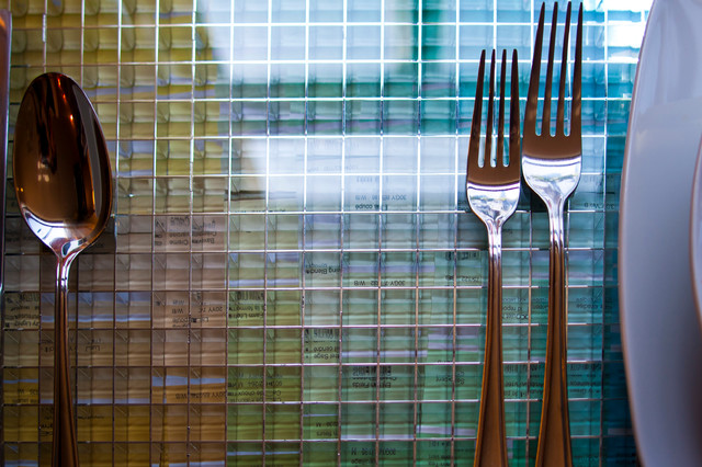 neat idea - table covered in swatches of paper, then a metal piece and then glass
