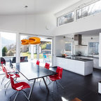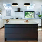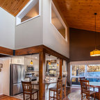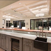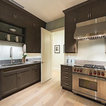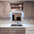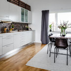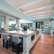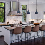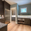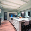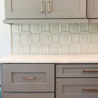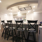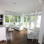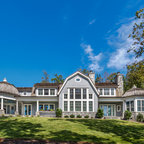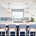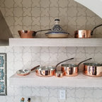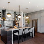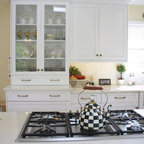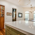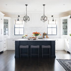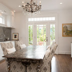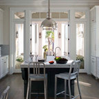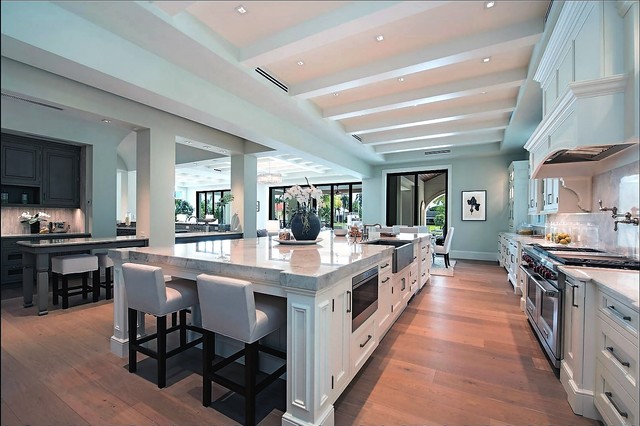 Foto di un'ampia cucina abitabile tradizionale con lavello stile country, ante con riquadro incassato, ante bianche, top in granito, paraspruzzi grigio, paraspruzzi in lastra di pietra, elettrodomestici in acciaio inossidabile, pavimento in legno massello medio e pavimento marrone — Houzz