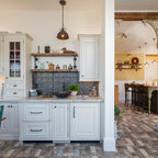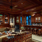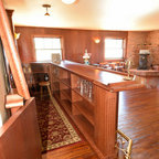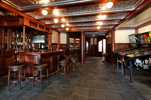 Immagine di un grande bancone bar vittoriano con ante in legno bruno, top in legno, pavimento in ardesia e top marrone — Houzz