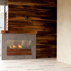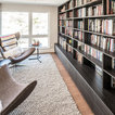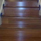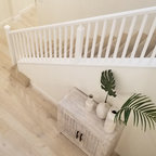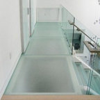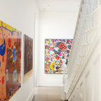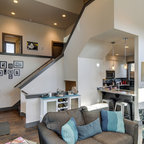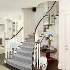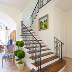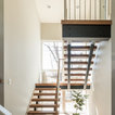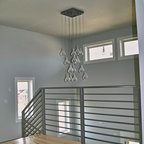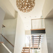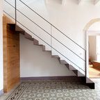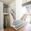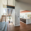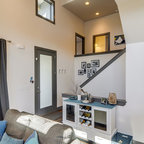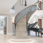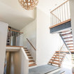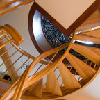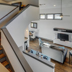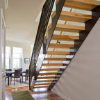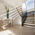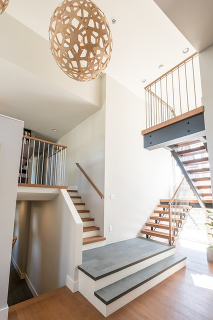 Foto di una grande scala a "U" contemporanea con pedata in legno, nessuna alzata e parapetto in materiali misti — Houzz