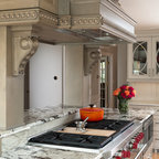 Esempio di una cucina classica di medie dimensioni con lavello a doppia vasca, ante con riquadro incassato, ante in legno bruno, paraspruzzi beige, paraspruzzi con piastrelle in pietra, elettrodomestici in acciaio inossidabile, parquet scuro, isola e top in granito — Houzz