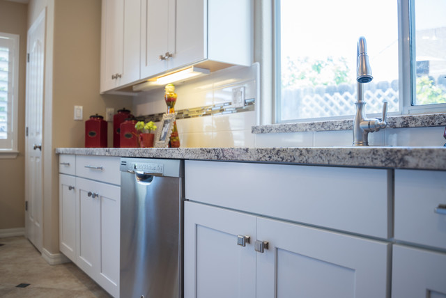 Esempio di una cucina tradizionale di medie dimensioni con lavello a doppia vasca, ante in stile shaker, ante bianche, top in granito, paraspruzzi in gres porcellanato, elettrodomestici in acciaio inossidabile, pavimento in travertino, paraspruzzi bianco e pavimento marrone — Houzz