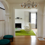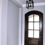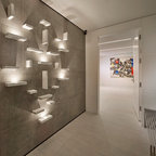 Ispirazione per una porta d'ingresso design di medie dimensioni con pareti bianche, pavimento in legno massello medio, una porta a pivot, una porta in metallo e pavimento grigio — Houzz