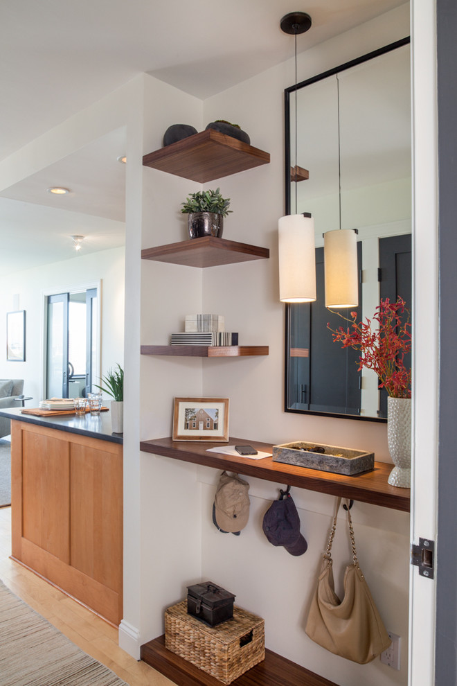 Siamo a Boston. Sulla destra dell’ingresso è stata posizionata una lunga mensola, definita da una specchiera e, a lato, da piccole mensole dove sono stati posizionati alcuni soprammobili. All’apparenza potrebbe sembrare un mini ripiano con funzione scrivania.