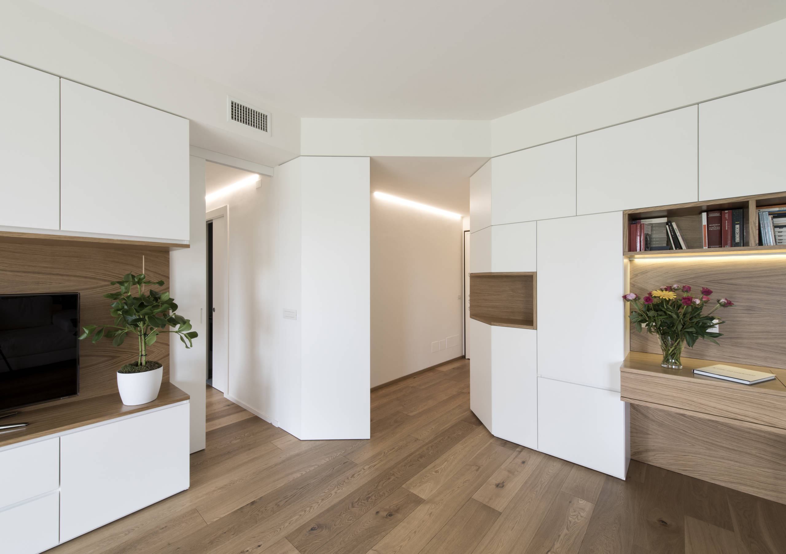 L’ingresso diventa parte integrante di questa “scatola bianca”: un’armadiatura che prosegue nell’ambiente giorno dove contiene, e insieme nasconde, diverse soluzioni contenitive.