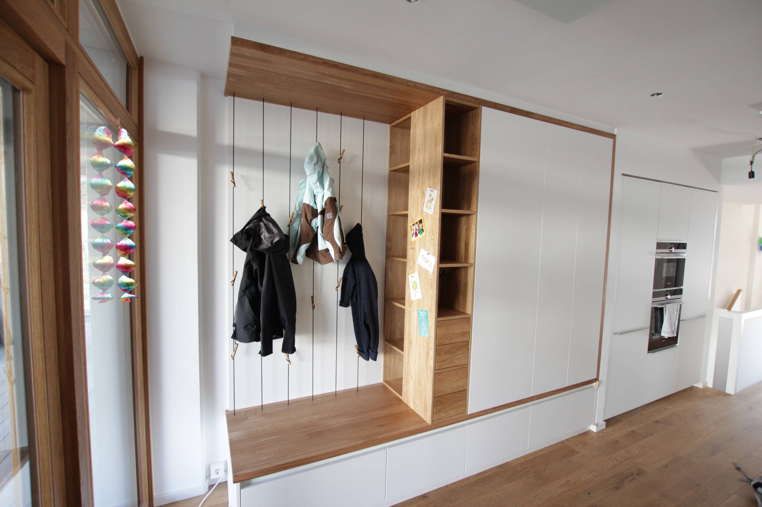 L’armadio è realizzato in massello di rovere. I ganci ai quali sono appese le giacche sono corde regolabili in altezza. A lato, vi sono vani aperti per porre piccoli oggetti d’arredo e armadiature chiuse dove, per esempio, è stato nascosto anche un ferro da stiro. Qui è possibile attaccare cartoline o foto con i magneti.