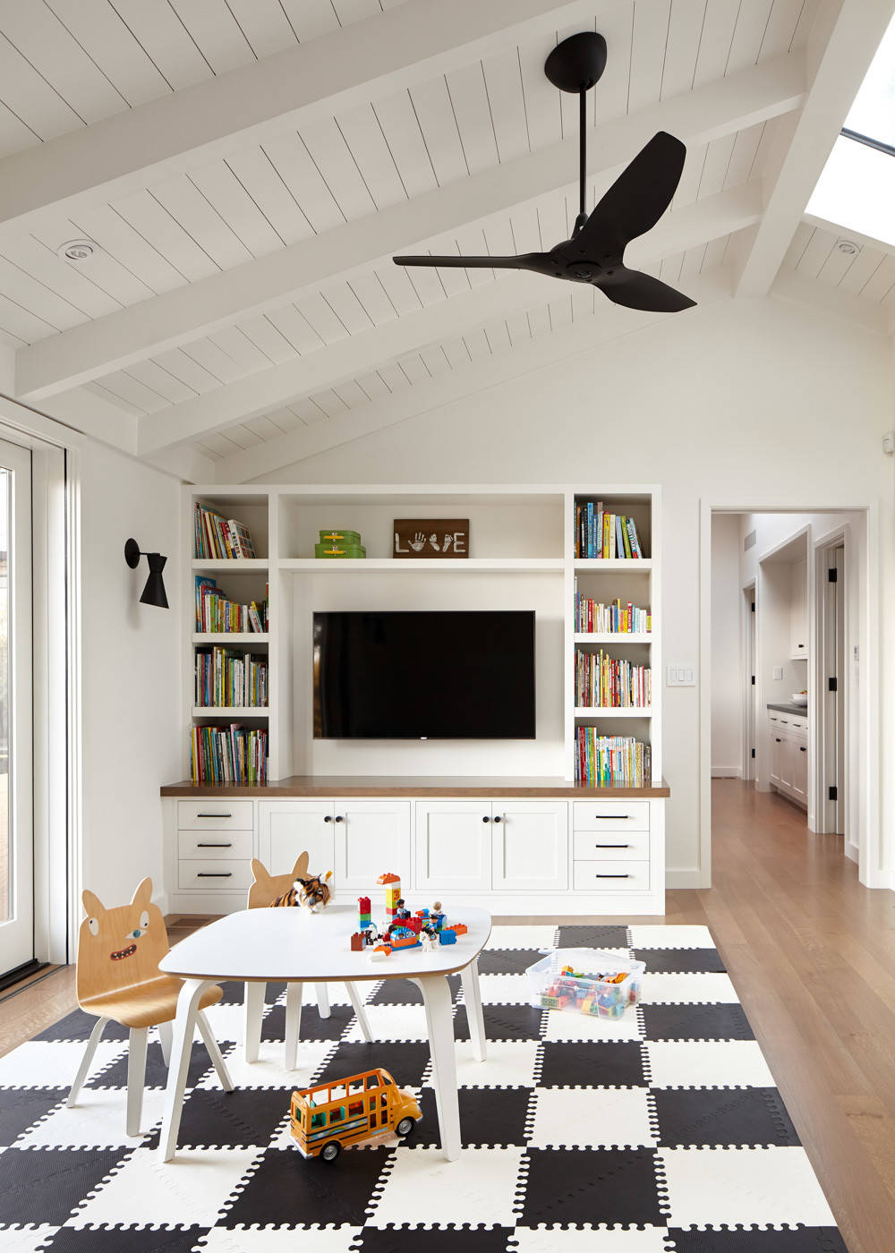 Scegliete l’angolo del soggiorno più indicato e lì posizionate ceste-giochi utili per riporre il tutto e tenere così la stanza il più possibile in ordine.