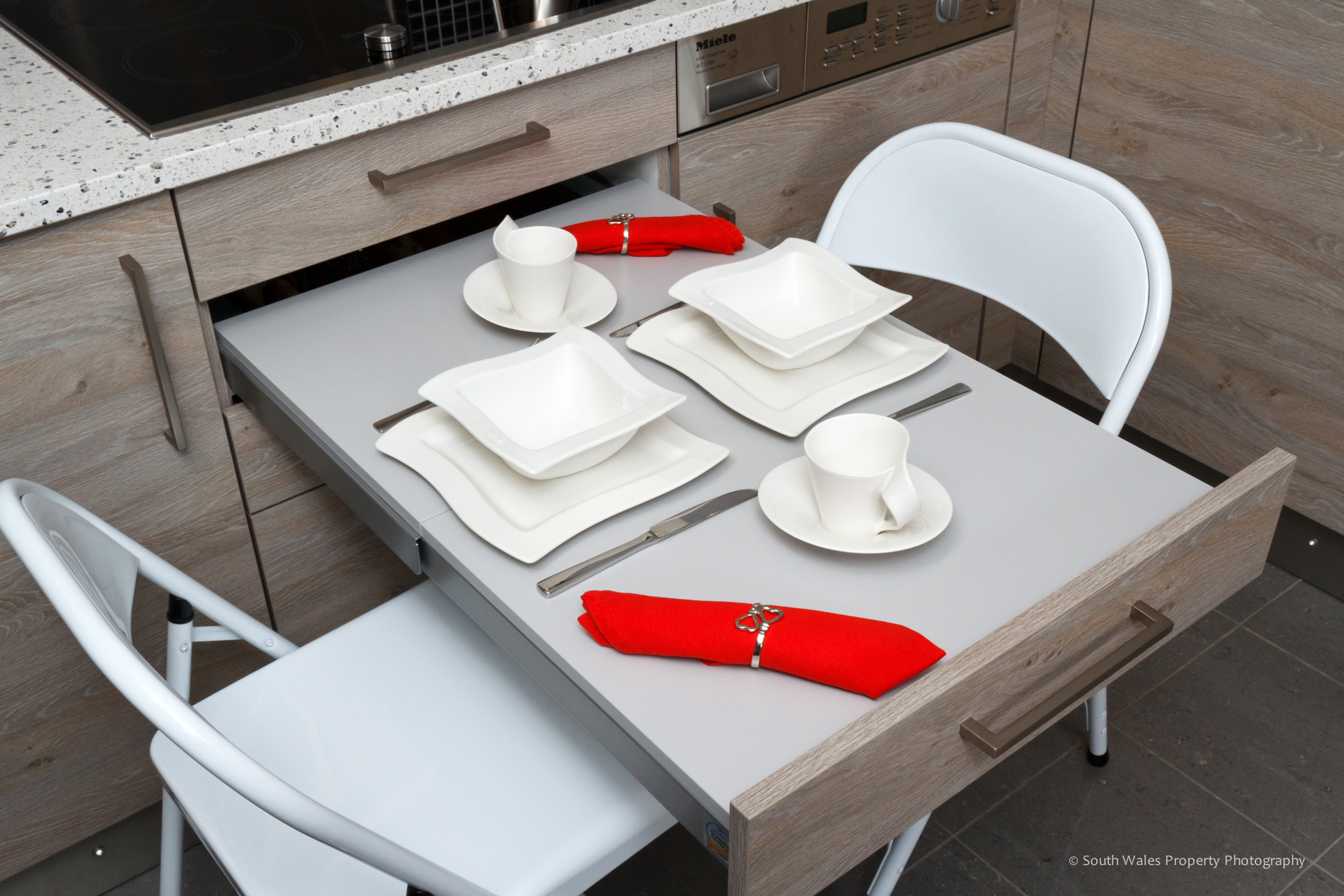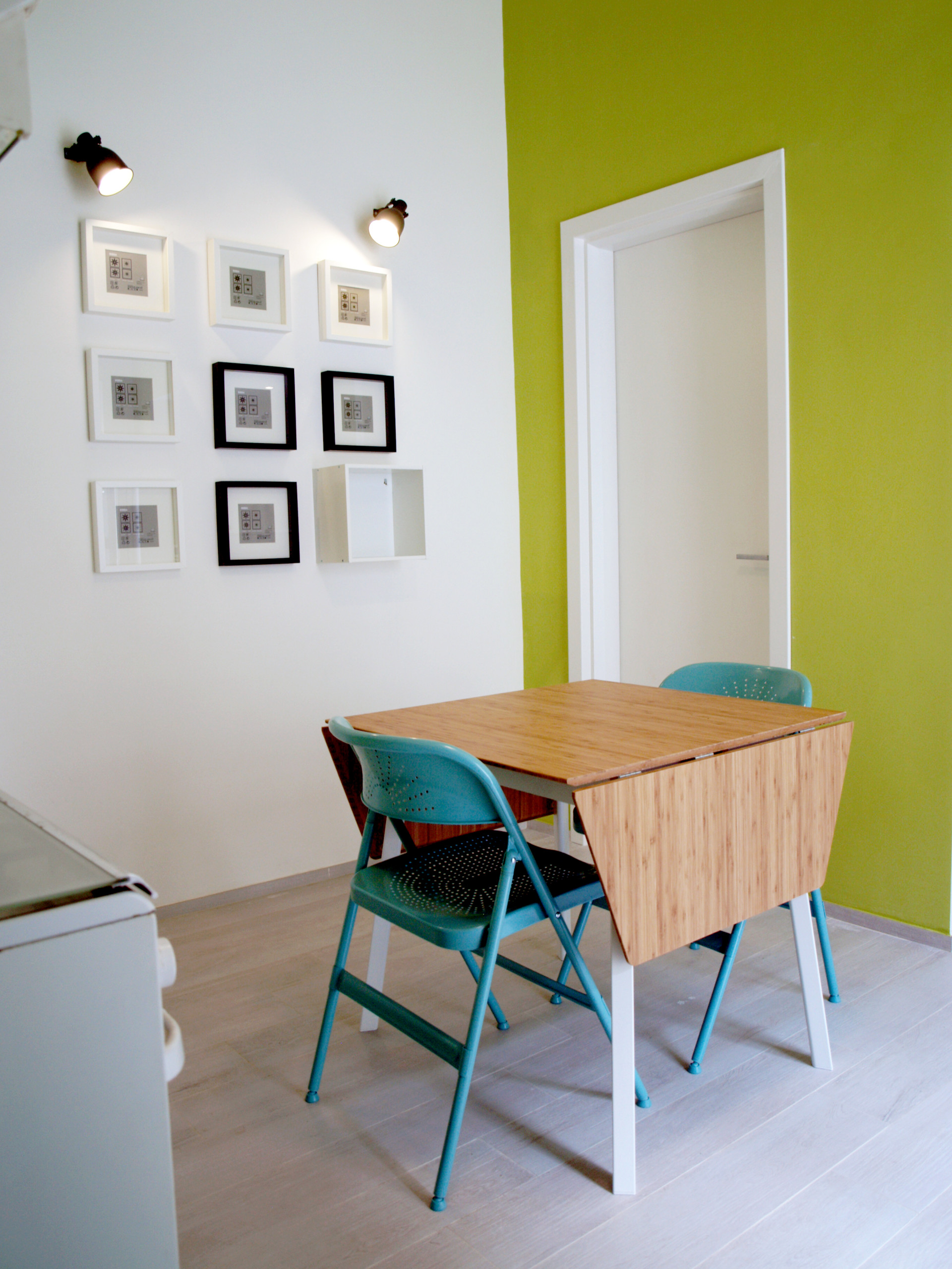 Sono sufficienti delle sedie pieghevoli da estrarre all’occorrenza e la mensola diventa un pratico tavolino per mangiare.