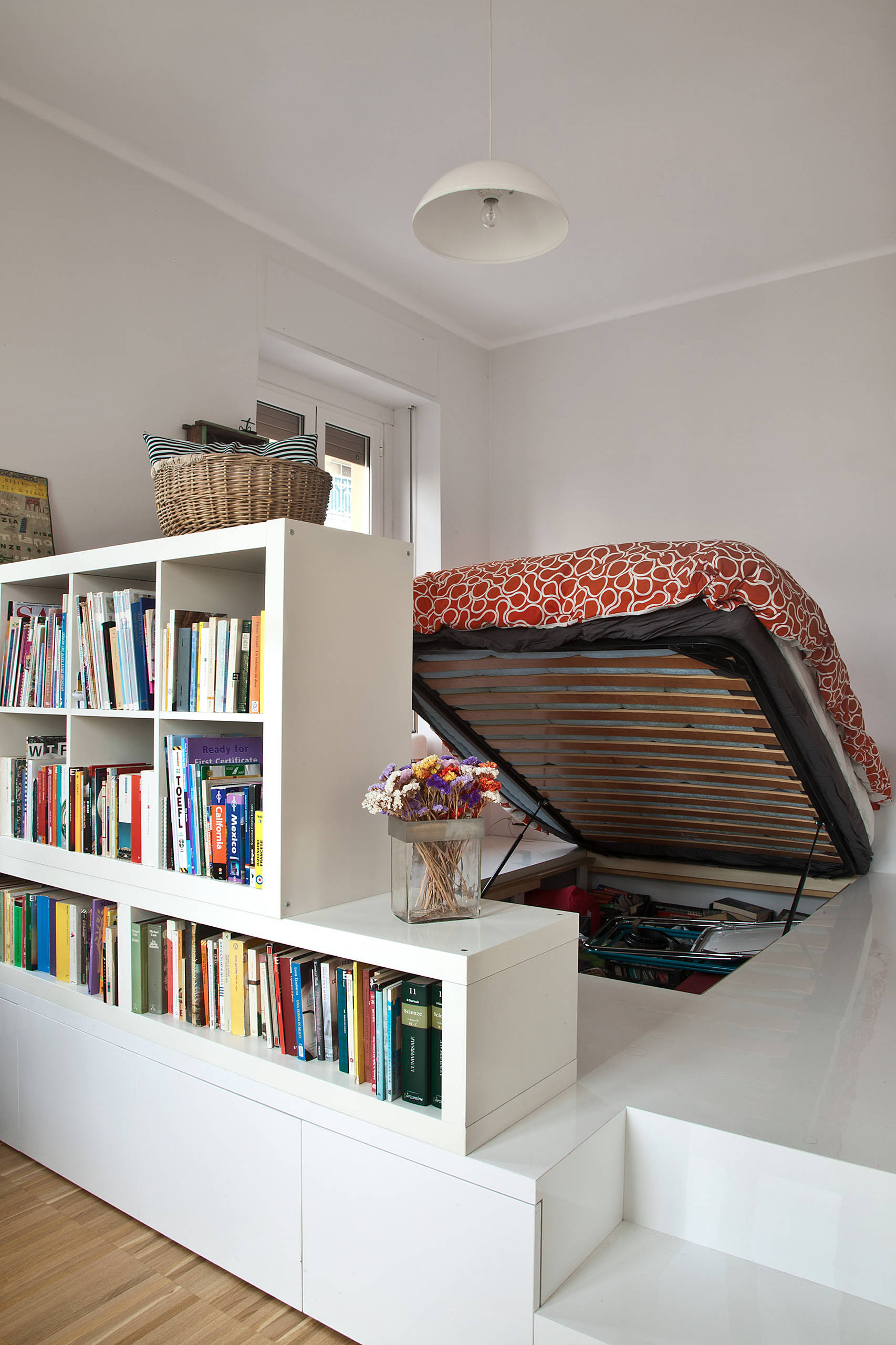 Dei gradini separano la zona notte dalla zona giorno creando un gioco di altezze? Puoi ottimizzare lo spazio sfruttando i dislivelli.