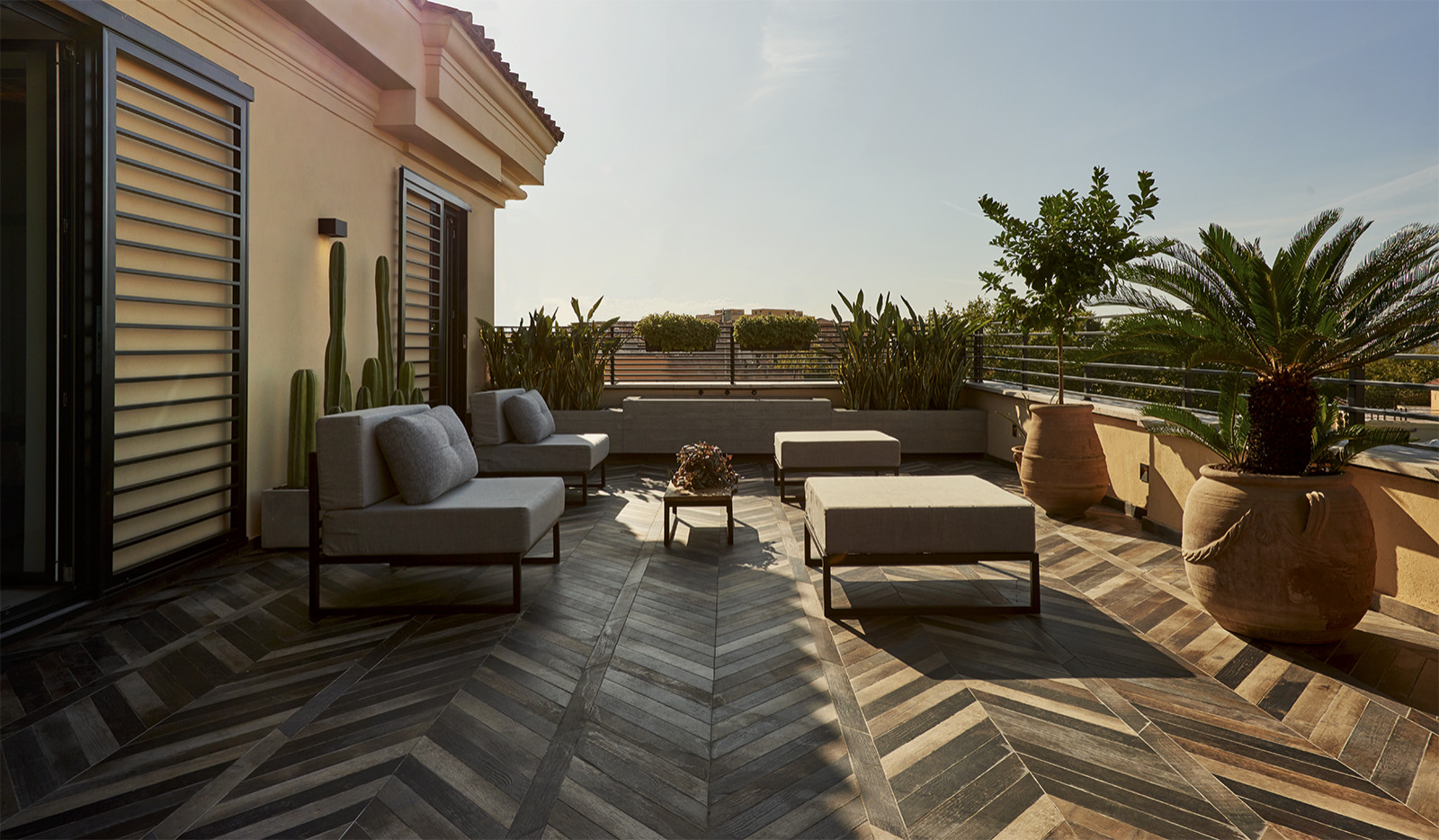 Tutte le stanze di questo appartamento nel centro storico di Roma si affacciano sulla grande terrazza con vista sulla città. Uno degli obiettivi della ristrutturazione curata dall’architetta Carola Vanini era di valorizzare questo spazio precedentemente trascurato. Ora, sia all’interno dell’appartamento che nella terrazza, i colori caldi esaltati dai dettagli neri si abbinano agli arredi su misura. La pavimentazione in gres effetto legno, che simula il classico motivo a spina di pesce, crea un passaggio fluido tra interno ed esterno.