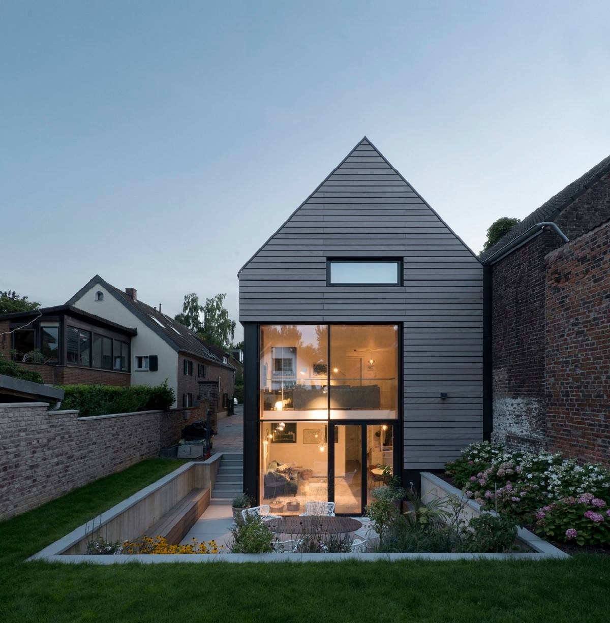In questo progetto di Heider Pannen-Vulpi Architekten, il livello inferiore della terrazza consente di avere un seminterrato luminoso, aumentando notevolmente lo spazio abitativo utilizzabile pur rimanendo all’interno delle normative locali sull’altezza degli edifici. Le grandi finestre conferiscono alla casa un’estetica moderna che è allo stesso tempo invitante e accogliente.