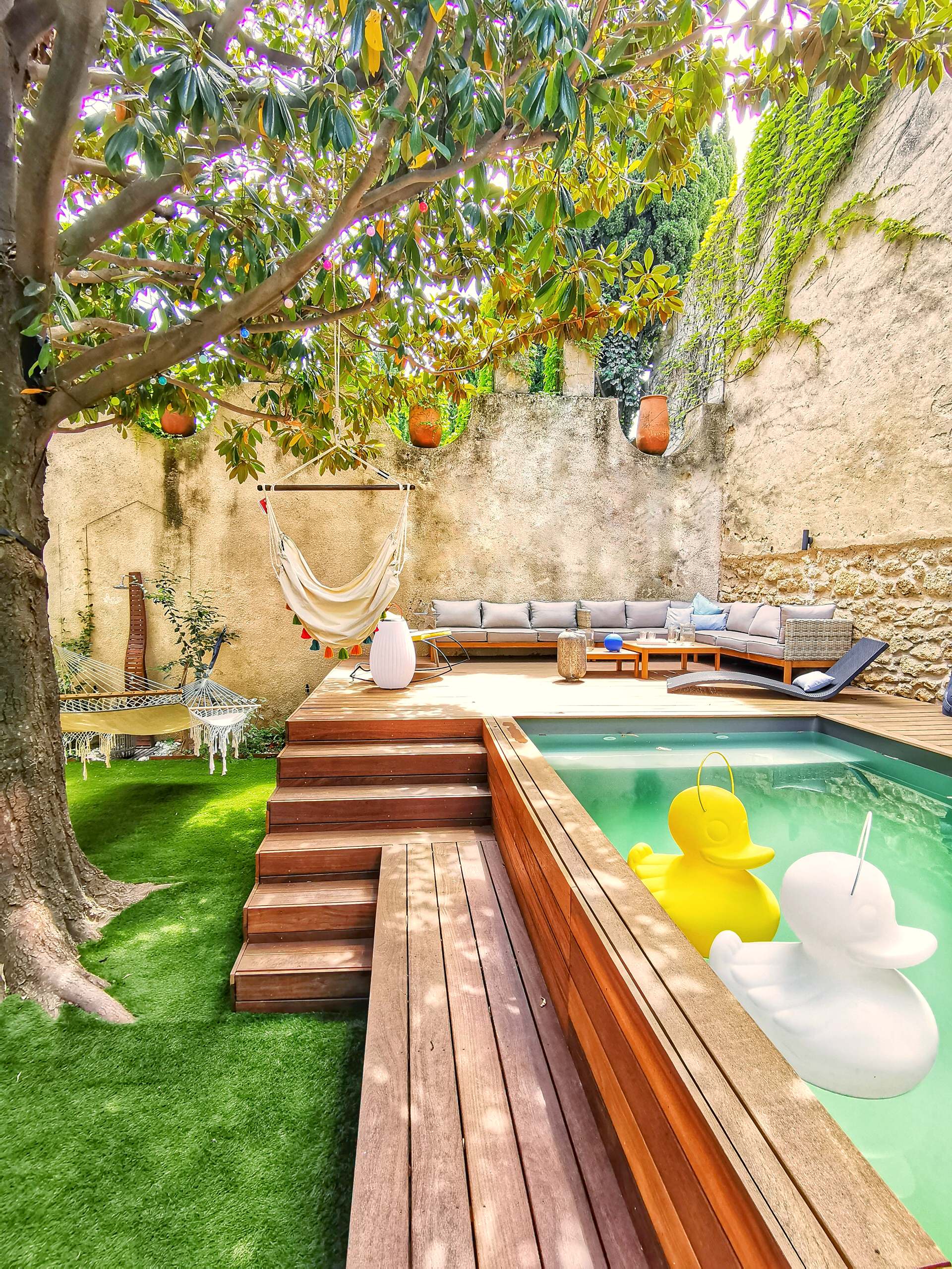 Le estese radici dell’albero di magnolia e il terreno roccioso poco profondo hanno impedito l’installazione di una piscina tradizionale in questo cortile di 13 x 12 metri circondato da alte mura. Con l’aiuto di abili professionisti del paesaggio, l’interior designer Laure Arancio di La Nostra Secrets d’intérieur ha trovato la soluzione: una pedana sopraelevata in legno che ha permesso di realizzare una piscina profonda 140 centimetri. Tutta l’attrezzatura tecnica è nascosta nei vani contenitori sotto la piscina.