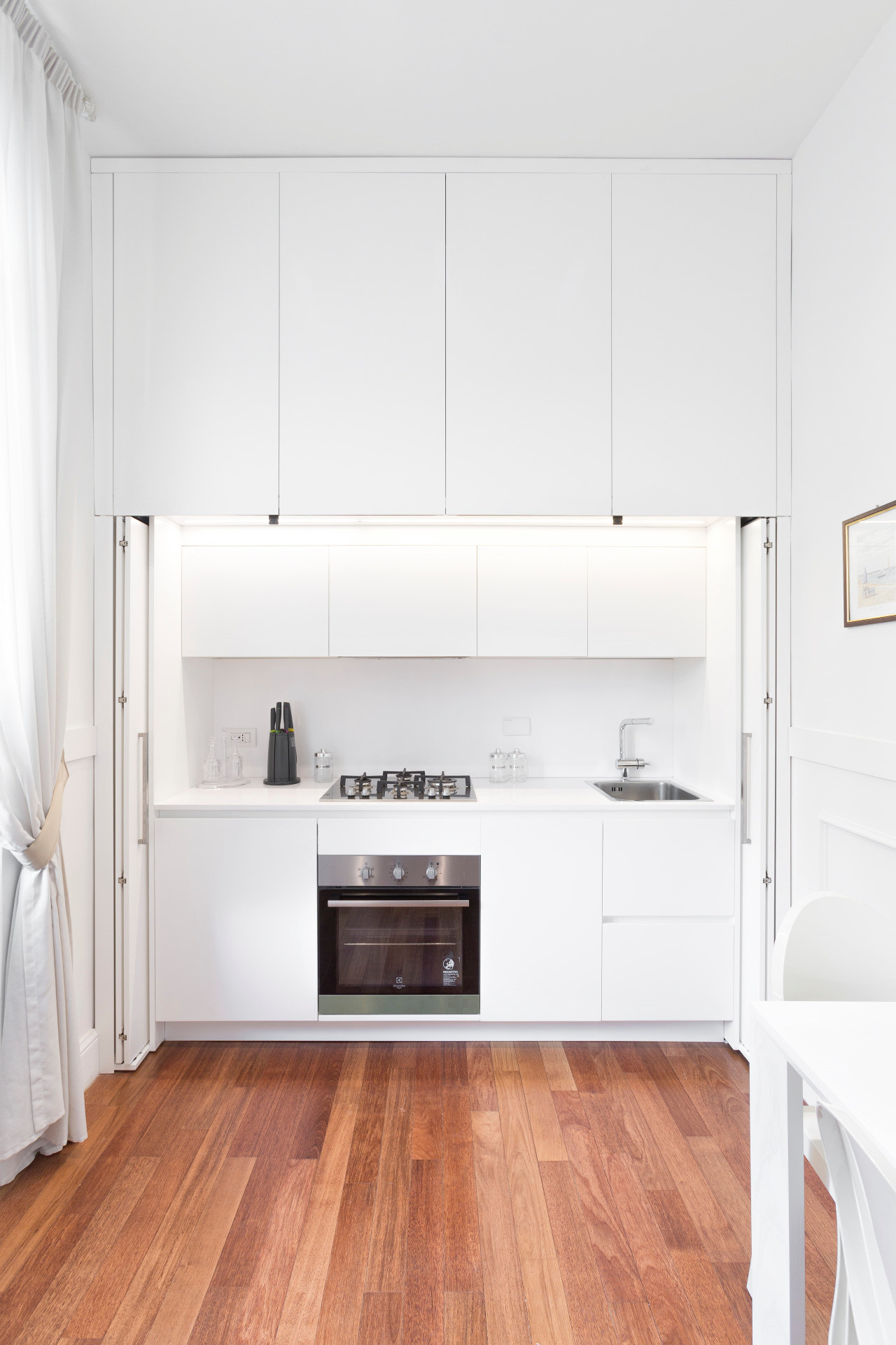 Meglio, allora, prevedere l’inserimento di porte scorrevoli, cosicché nemmeno un centimetro della mini-cucina venga rubato da altri elementi e si ottimizzi al massimo lo spazio disponibile.