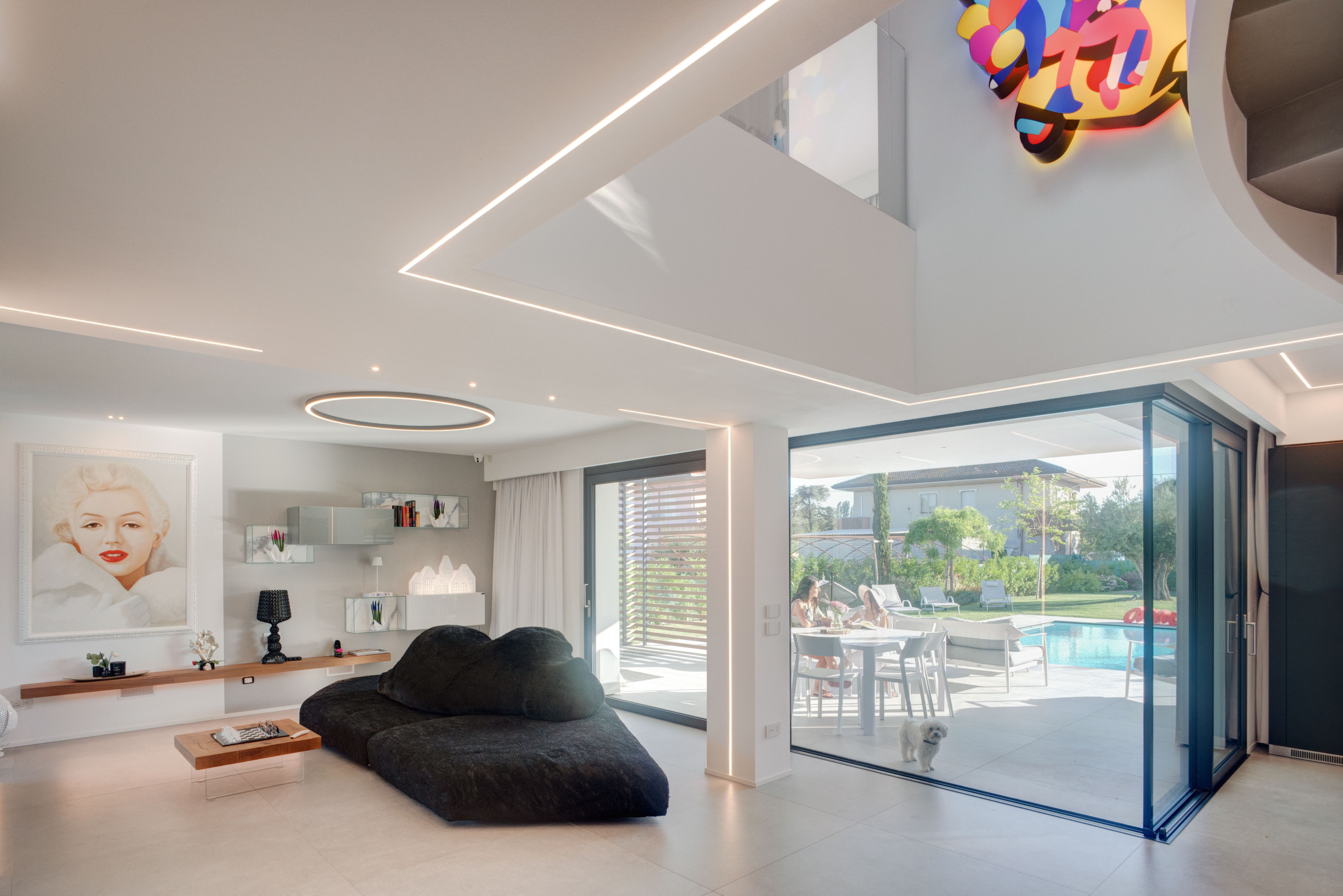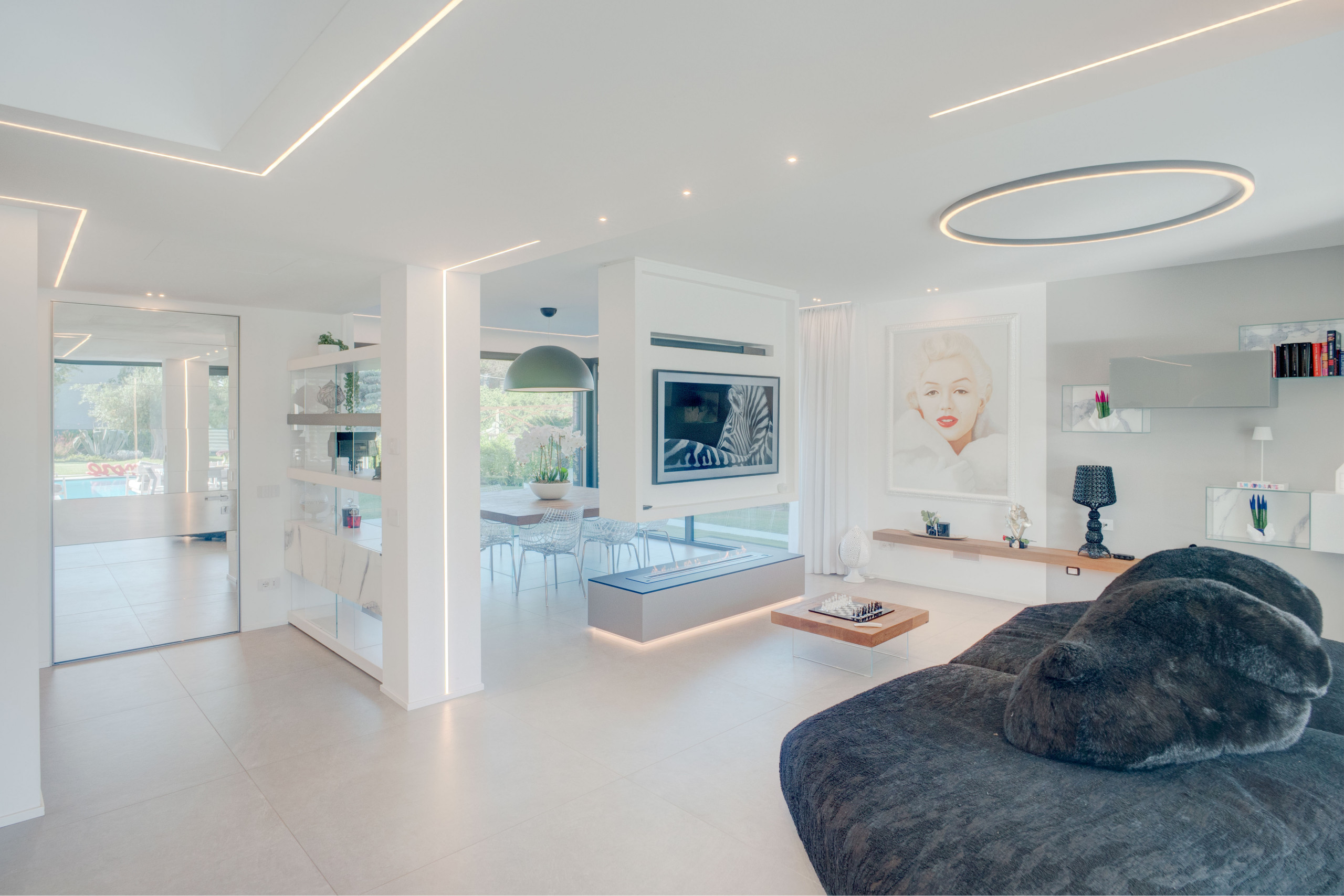 Davanti alla porta di ingresso e in corrispondenza dei passaggi ai lati del camino-tv o davanti ai quadri di maggior rilievo sono stati applicati faretti doppi di Belfiore serie 9010; «per marcare i due portali tra l’ingresso e la sala abbiamo lavorato con dei profili led continui verticali sui pilastri che girano anche sul soffitto e vengono intervallati da faretti singoli sempre di Belfiore».