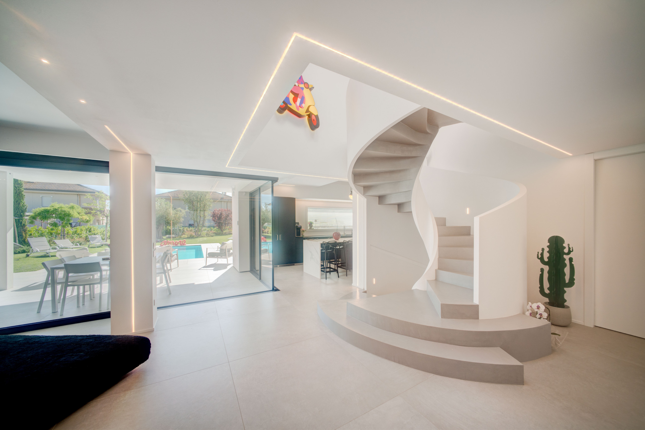 La scala elicoidale cemento armato con i sui 260 cm di diametro (nella foto precedente) è stata marcata con segnapassi a integrazione totale.