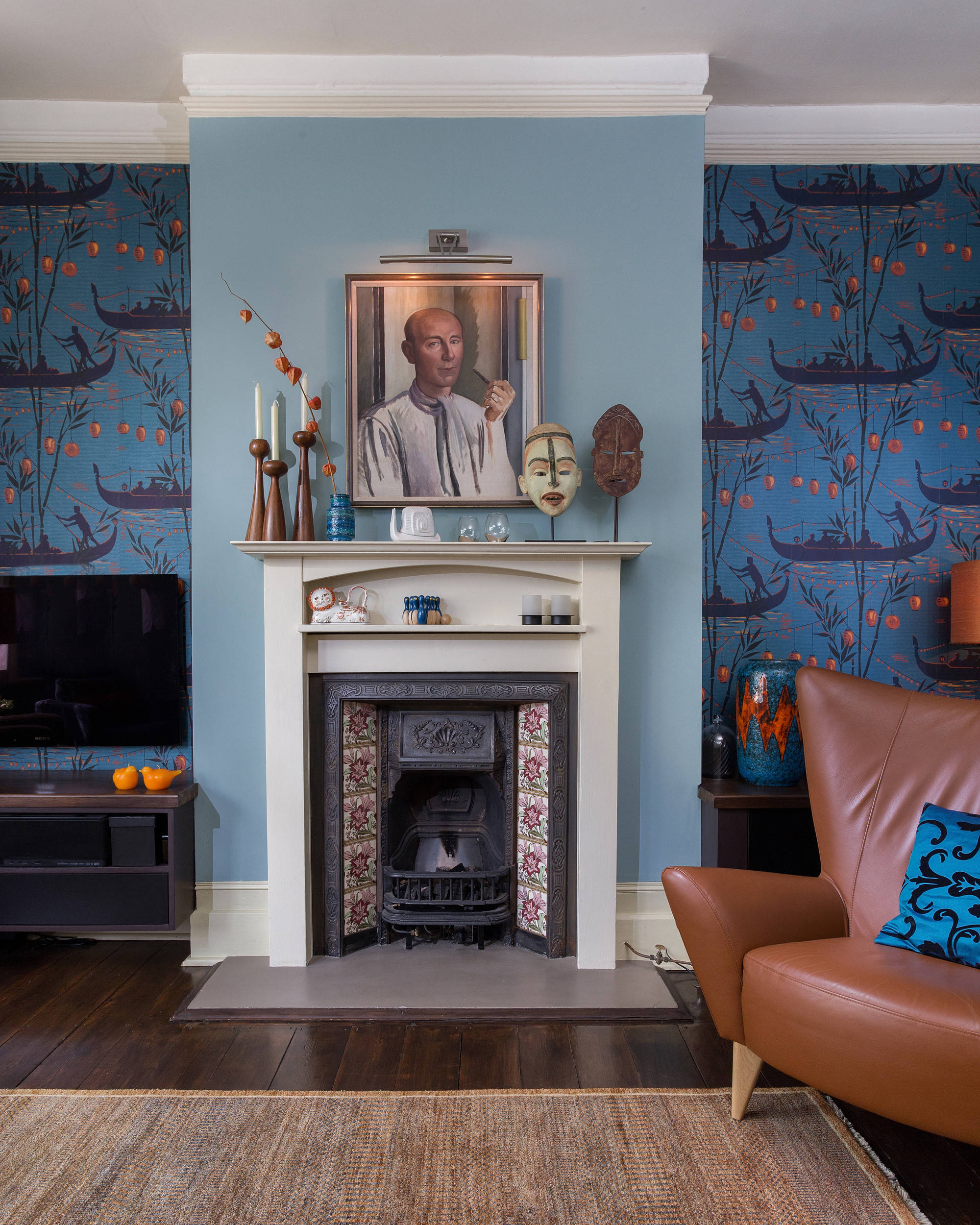 Anche questo camino è in stile inglese, con una graziosa cornice di piastrelle dal disegno art déco.