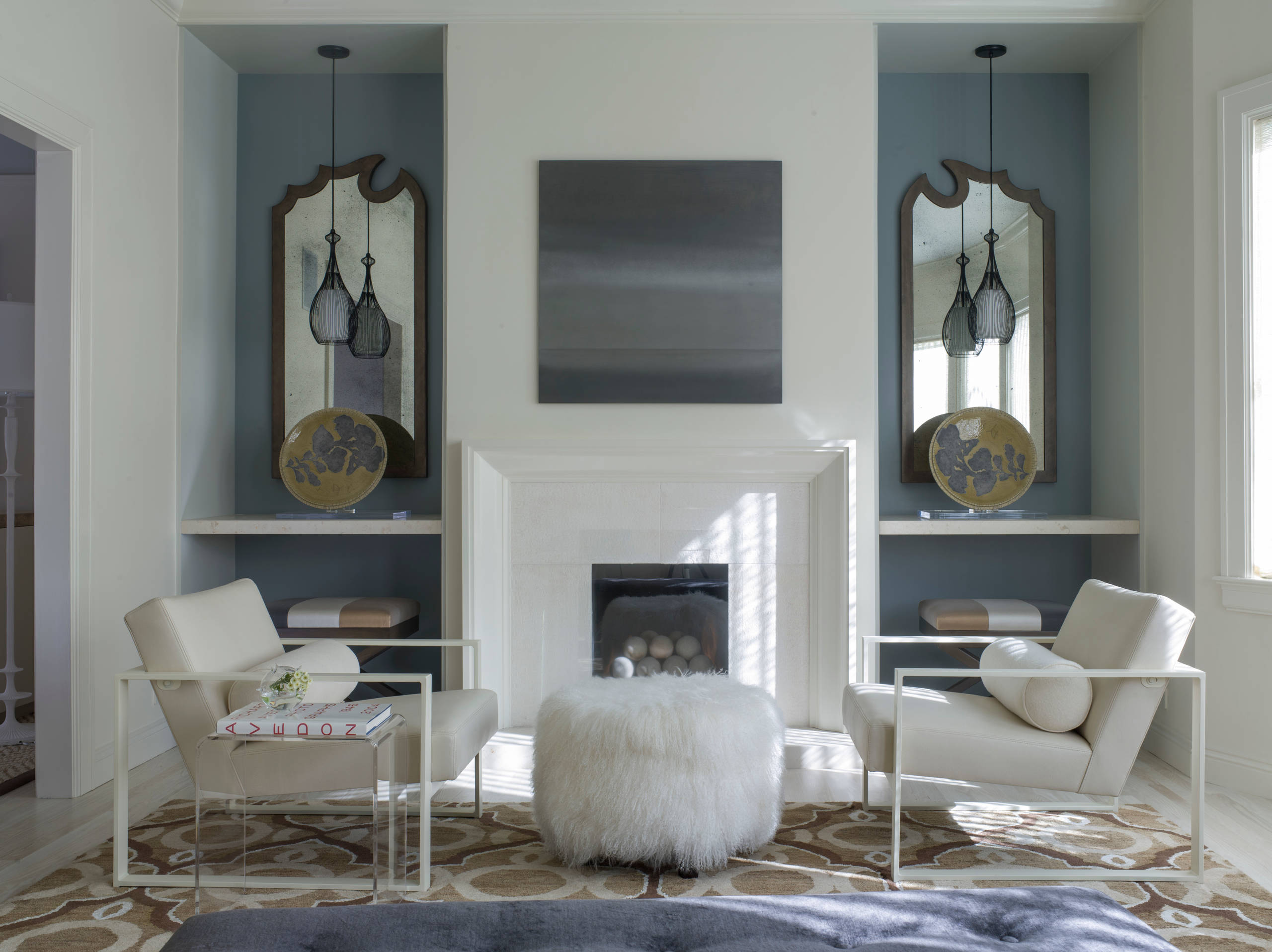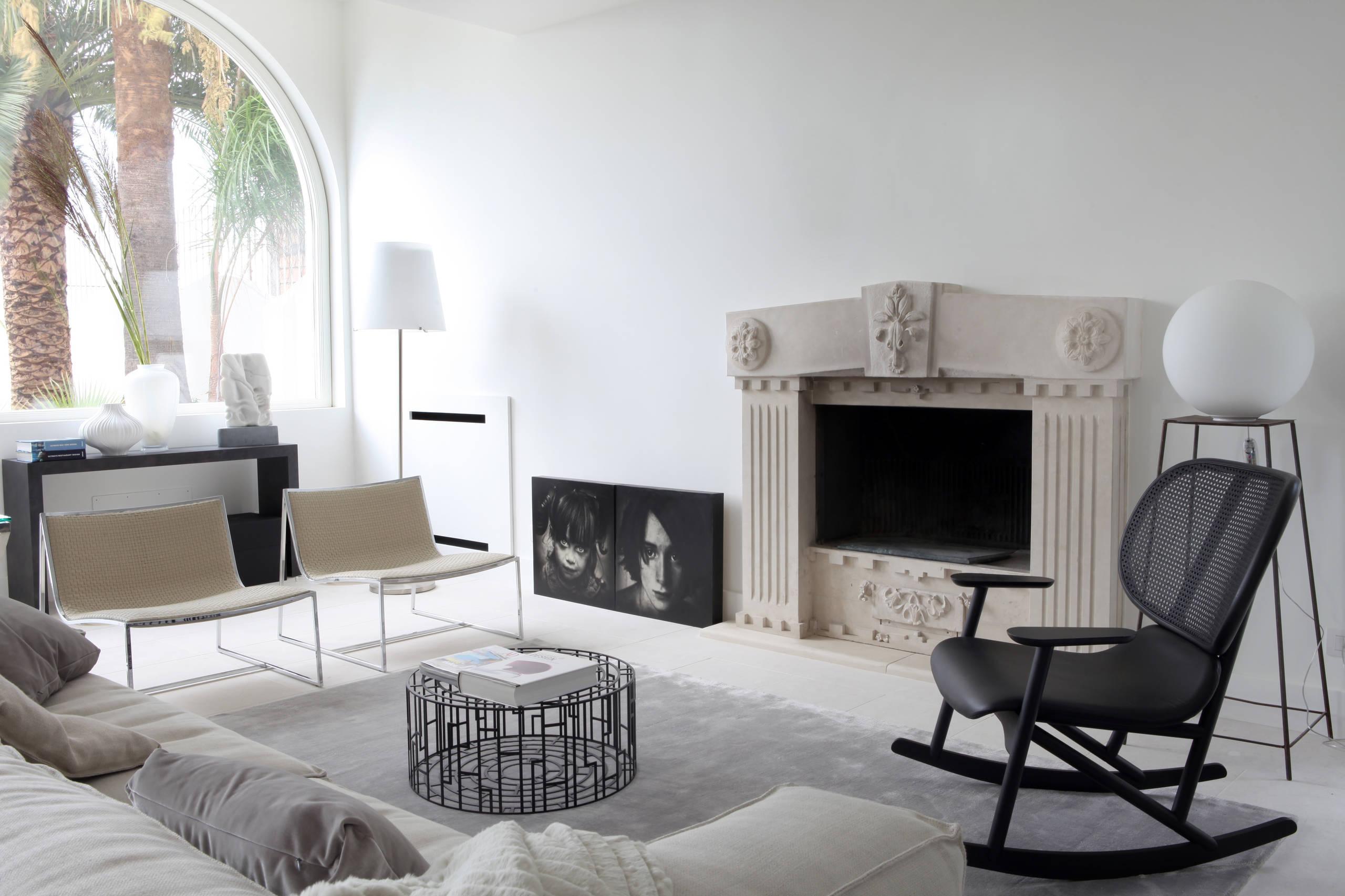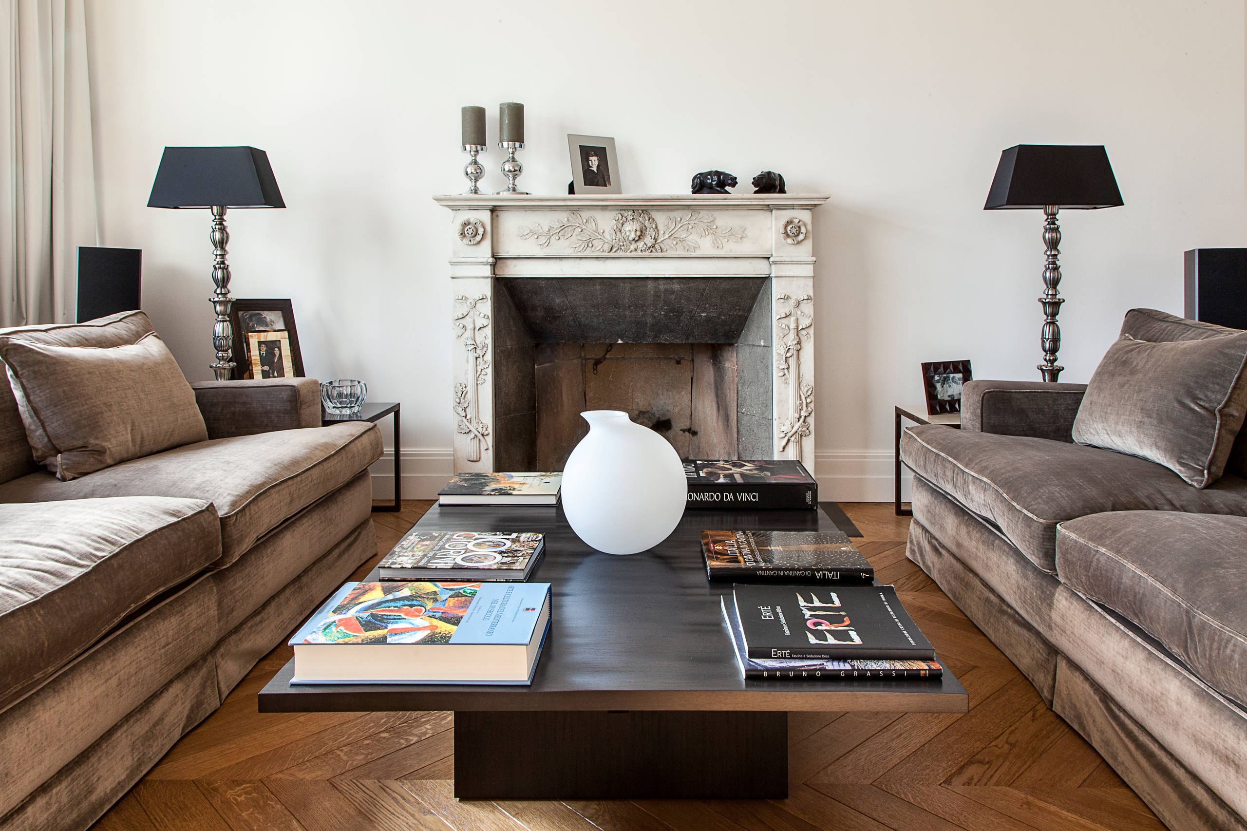 Questo camino classico in marmo con decori si integra perfettamente in un salotto dallo stile minimale, rendendolo più caldo e accogliente.